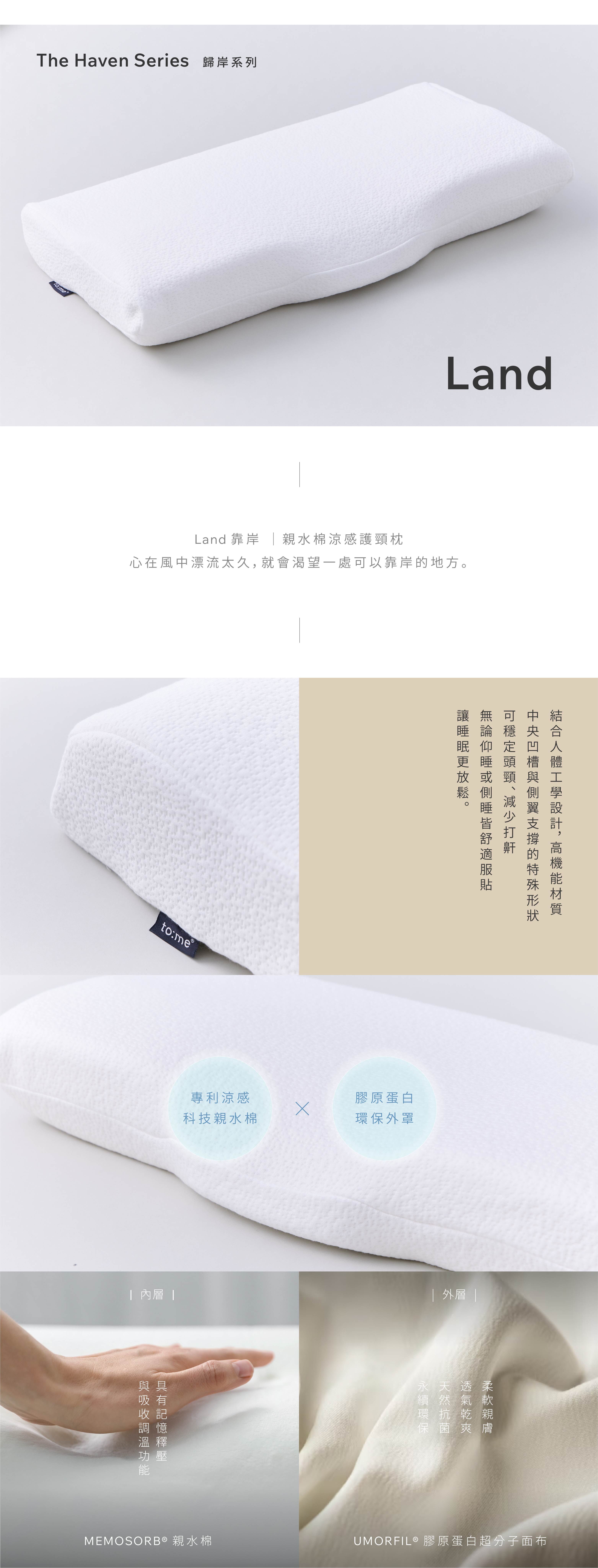 「Land 靠岸|親水棉涼感護頸枕」結合人體工學設計與高機能材質